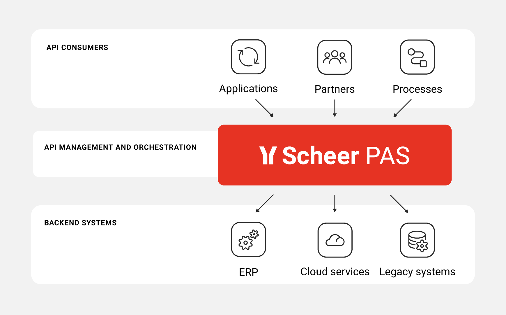 Scheer PAS provides a centralised, process aware API management layer that enables enterprises to expose, govern, and orchestrate APIs consistently – reducing risk, improving transparency, and supporting scalable integration across the IT landscape.