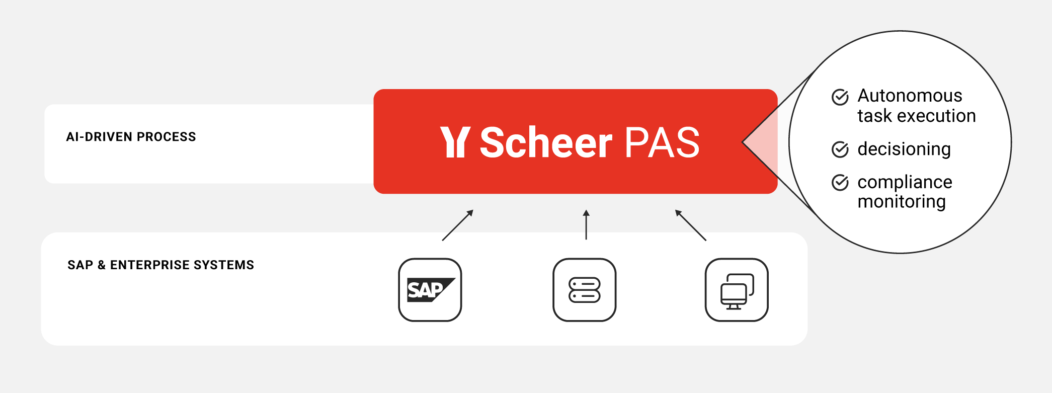Scheer PAS integrates SAP systems (ECC and S/4HANA), legacy applications, and partner platforms into a unified process layer. Agentic AI helps coordinate actions across systems, reducing manual handovers, duplicate data entry, and fragmented ownership.
